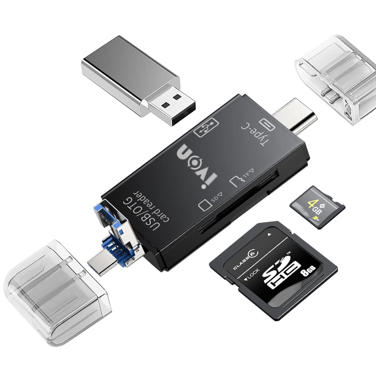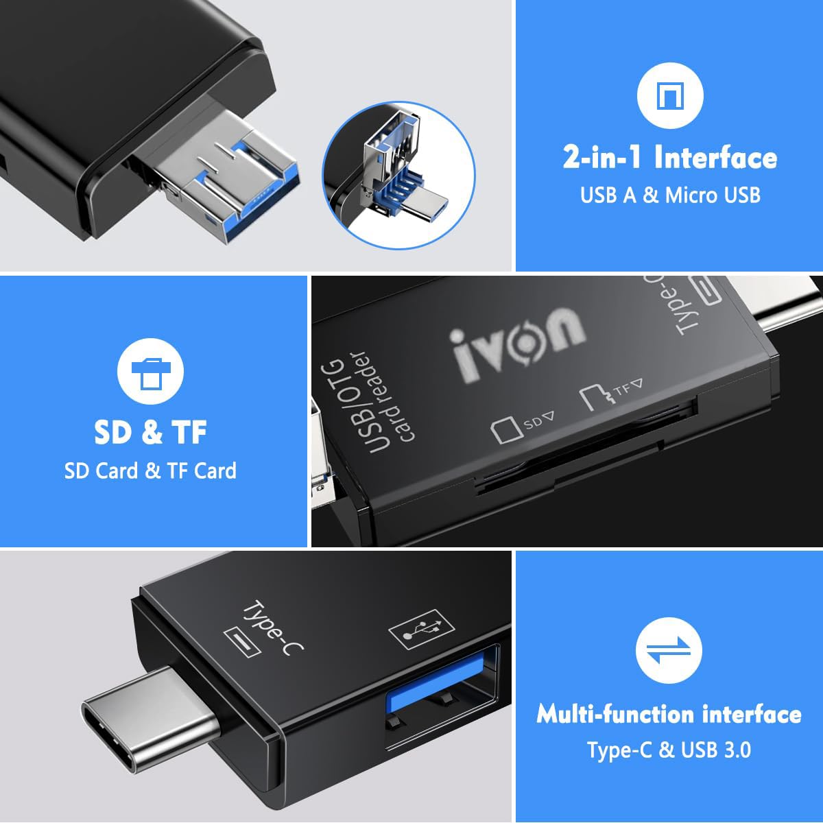 IVON OTG 6 IN1 Multifunctional Card Reader, Micro SD/TF External Card Reader, USB C to Micro USB/USB A Convertor for Charging and Data Transfer (Black)