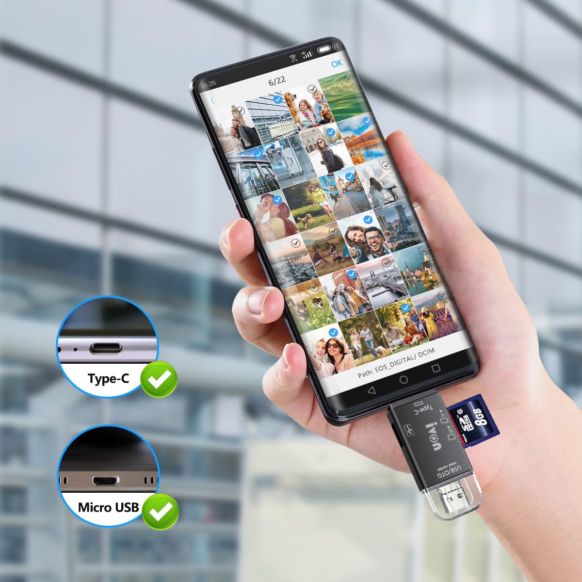 - 【Multifunction】SD Card Reader set the USB 3.0 plug (Type A)Male and Female, Micro USB plug (Type B), and USB C plug (Type C) in one, making this card reader compatible with all USB C devices support OTG function.