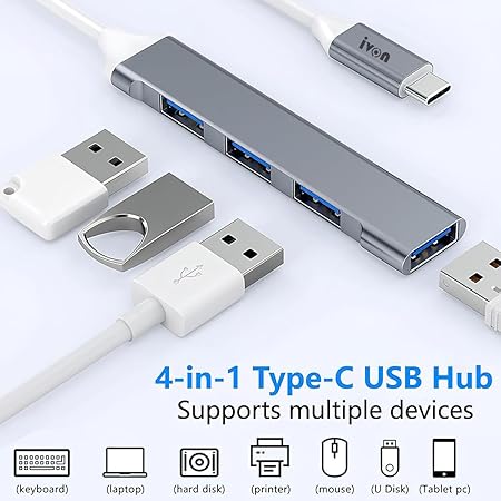 1. 4-Port USB Hub: Expands a single USB-C port into 4 USB-A ports for connecting multiple devices at once. 2. USB 3.0 & USB 2.0 Support: Offers high-speed data transfer up to 6Gbps with USB 3.0, while maintaining compatibility with USB 2.0 devices. 3. Durable Metal Design: Built with a sturdy metal body for better durability and heat dissipation. 4. Wide Compatibility: Works seamlessly with laptops, smartphones, tablets, and various USB peripherals such as: Keyboard & Mouse External Hard Drives (HDD/SSD) Printers & Projectors Game Controllers 5. Plug & Play: No drivers or software required — just plug in and start using. 6. Portable & Lightweight: Ideal for both desktop setups and travel use Package includes: 1 Unit of IVON Type-C 4port USB HUB Handling and Packing: Packing done with good amount of care so that you get the item in good condition. it is your responsibility to ensure that the packet received is in non-tampered condition. If the pack is open please refuse to receive the order and return it with same logistics person 100% Tested product.